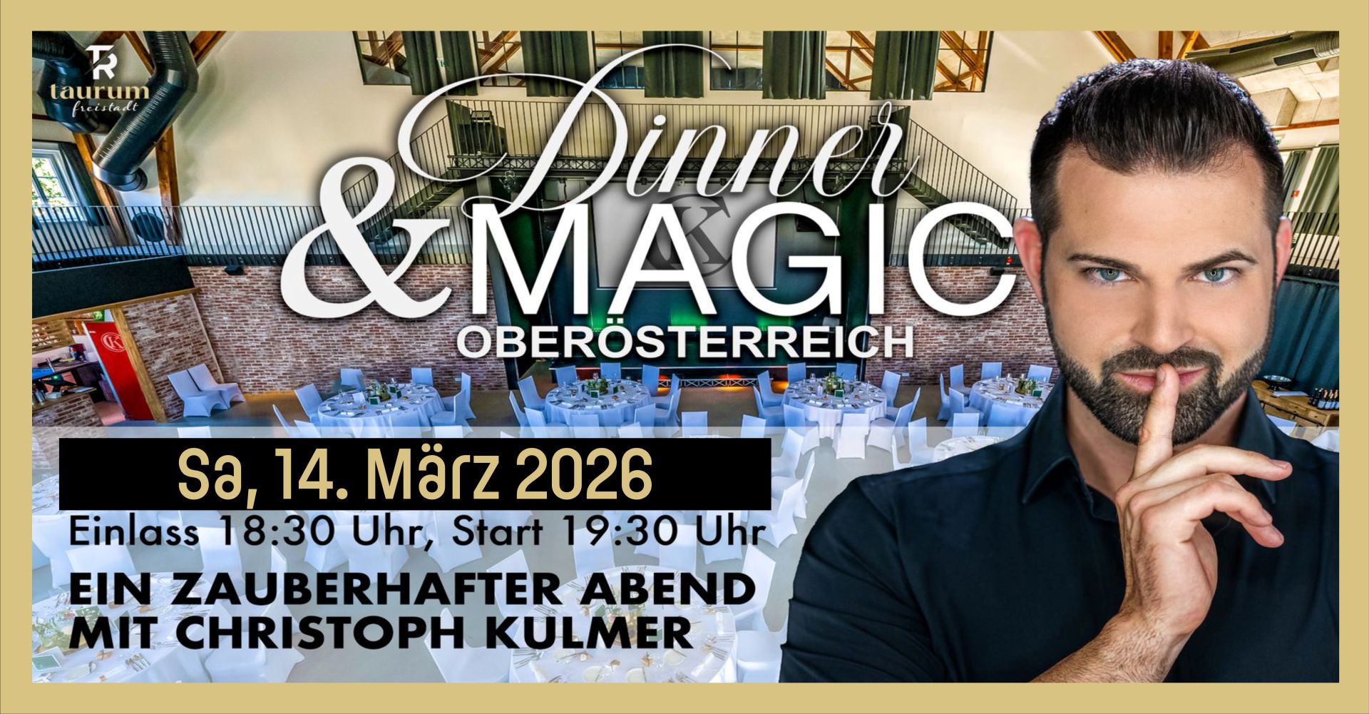 Die erfolgreiche Magic Dinner Reihe geht wieder weiter. Sichert euch heute noch Tickets für die perfekte Kombination aus hochklassiger Zauberkunst und einem erstklassigem 4 Gang- Menü. Das ideale Geschenk für den Partner/Partnerin oder einen ganz speziellen Anlass.